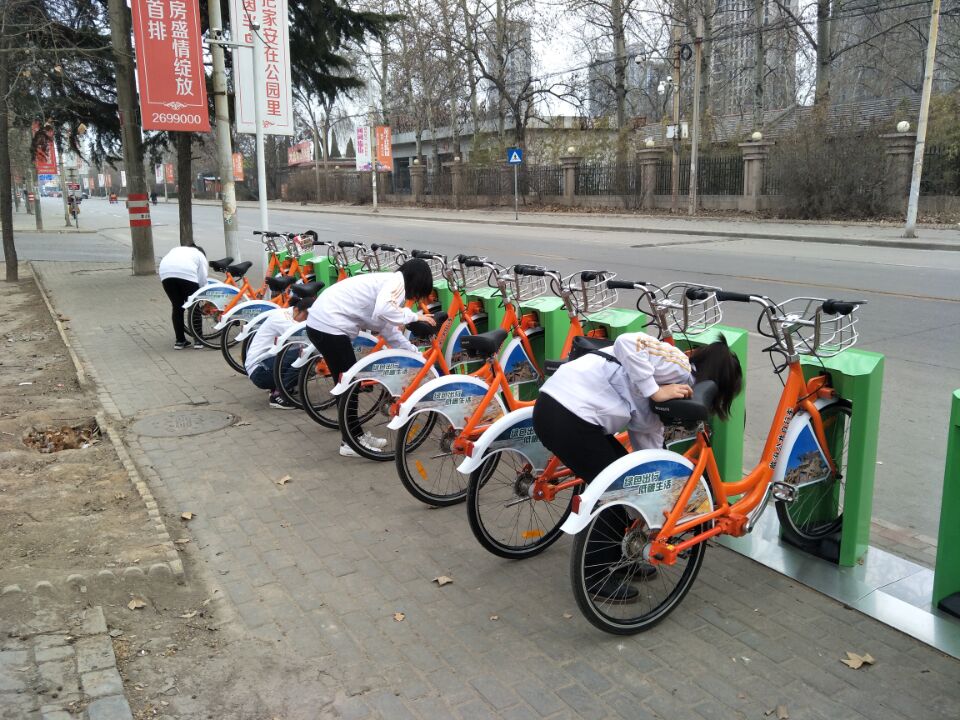 志愿者分别对尧都公园、临汾市人民政府、美特好超市、世界杯2026官方网站体育公司等4处站点的公交自行车、驻锁以及停靠设施进行了全面的清洁。志愿者们带着毛巾和水等清洁工具,在不影响市民租赁的情况下,对自行车进行仔细清洗。大家相互合作,合理分工,积极配合,从车把手到坐垫,从车身到车轮,从自行车到锁桩,同学们用心擦洗,不放过任何一个卫生死角。寒风凛冽中,志愿者们毫不退缩,积极热情地投入到清洁工作中,现场忙碌不已。经过一下午的努力,公共自行车站点的公共自行车焕然一新。同学们的工作不仅是让周边的公共自行车变得洁净,更向社会传达一种正能量:爱护公物,奉献社会,是每一个公民应尽的义务。