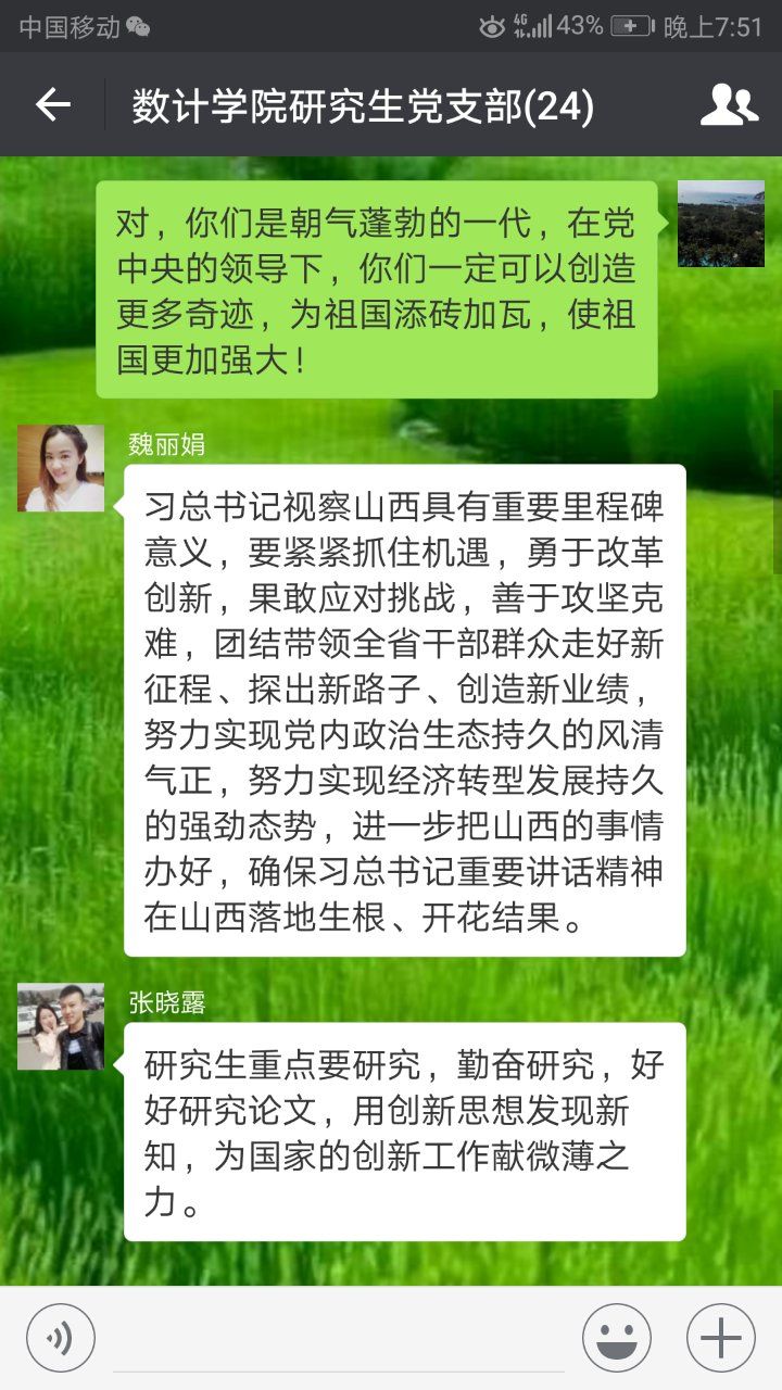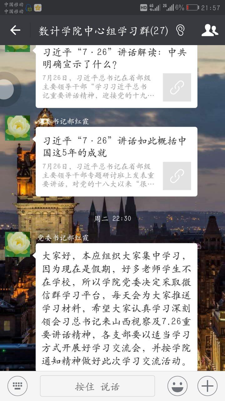 公司党委通过2026世界杯官网中心组微信学习群和各党支部微信群,每天推送学习专题,党员干部带头对讲话精神进行深入解读,交流学习心得。各党支部书记主持开展本支部的学习交流会,每位党员结合自身的工作和实际,在群里谈心得,讲体会。大家一致表示,要自觉维护以习近平同志为核心的党中央的权威,牢固树立“四个意识”,不断增强“四个自信”,要把讲话精神融入到教学科研、人才培养的各项工作中,落实到行动上。