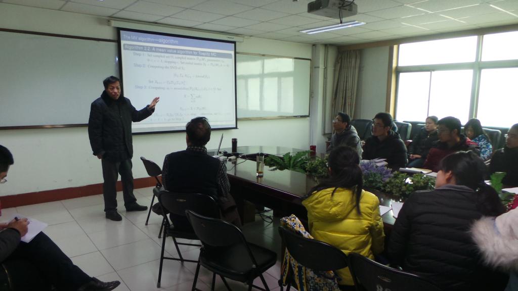 2016年1月2日,在世界杯2026官方网站科学会堂A座802会议室,山西太原师范公司的王川龙教授做了题为New Algorithms for Toeplitz Matrix Reconstruction的学术报告。在当天的学术报告上,王川龙先从矩阵填充(Matrix)方面介绍了问题的研究思路,即转化为凸优化问题,解决唯一解。并介绍了FPCA、APG、SVT、ALM(lagrange乘子算法)等凸优化算法。其次从矩阵恢复(recover)方面进行了介绍,结合应用实例,比较了保结构算法和平均值算法等研究方法的优缺点。