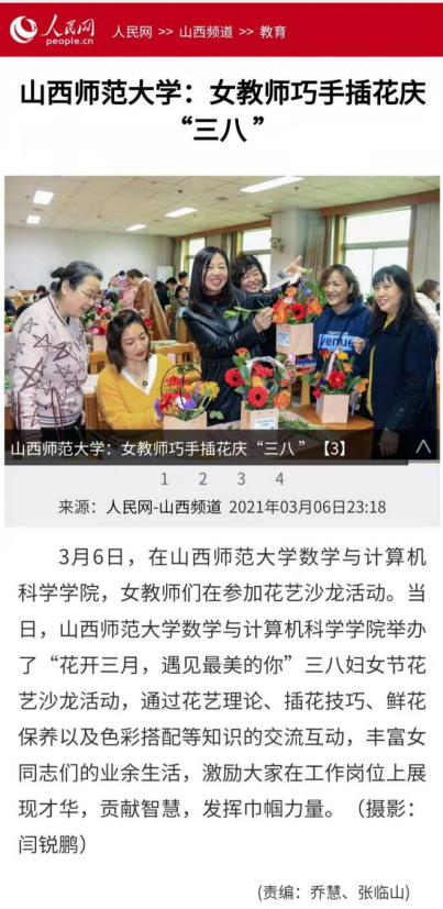 人民网-山西频道对公司本次活动进行了报道,报道中的四张照片生动而又自然,将女同胞们学习插花的热情展现的淋漓尽致,照片中还有几位教师积极展现自己的插花成品。《山西法制报》3月8日版第6版要闻同步进行了图片报道。