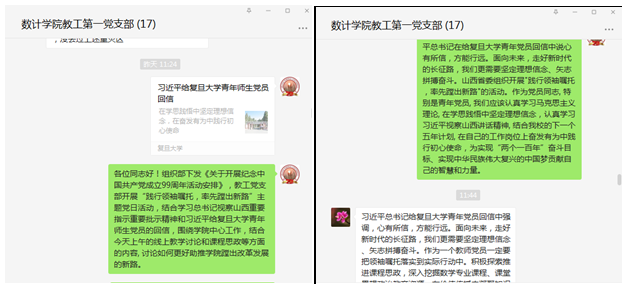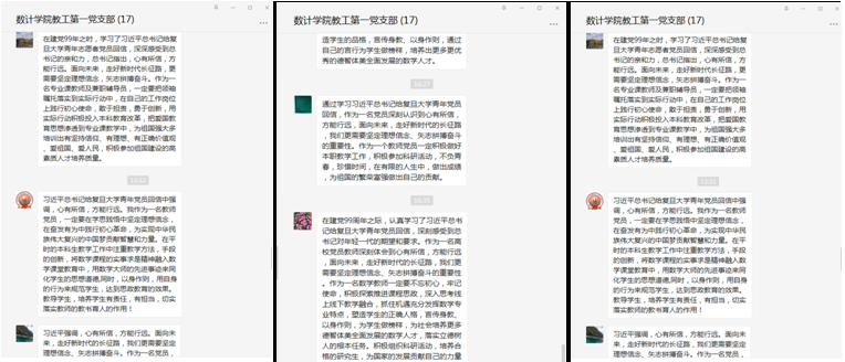 会后,同志们在支部群里,围绕习近平总书记的回信,结合公司的课堂思政改革纷纷发言,表示要在自己的工作岗位上,践行领袖嘱托,率先蹚出新路,为社会培养更多德智体美全面发展的数学人才,落实立德树人的根本任务。