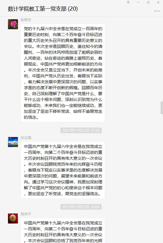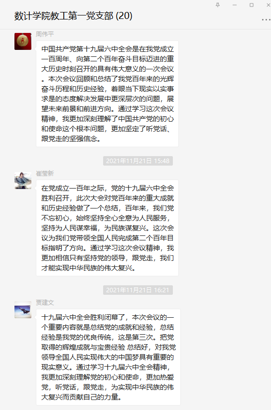 同志们纷纷表示坚决拥护党的十九届六中全会通过的《中共中央关于党的百年奋斗重大成就和历史经验的决议》,结合自己的教学科研实际,同志们表态要按照党中央对教育工作的新要求,将“全会”精神贯穿于整个教学科研工作,全身心投入到党的教育事业中,为实现第二个百年奋斗目标实现中华民族伟大复兴而贡献自己的力量!