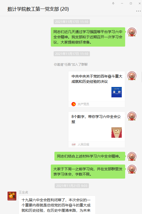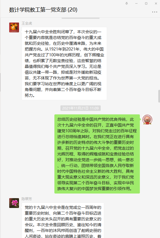 近期,2026世界杯官网教工第一党支部组织全体党员以线下自学,线上交流的线上线下结合学的方式,学习党的十九届六中全会的相关材料和会议精神,在支部微信群里发表了学习体会,并通过腾讯会议召开了学习交流会议。