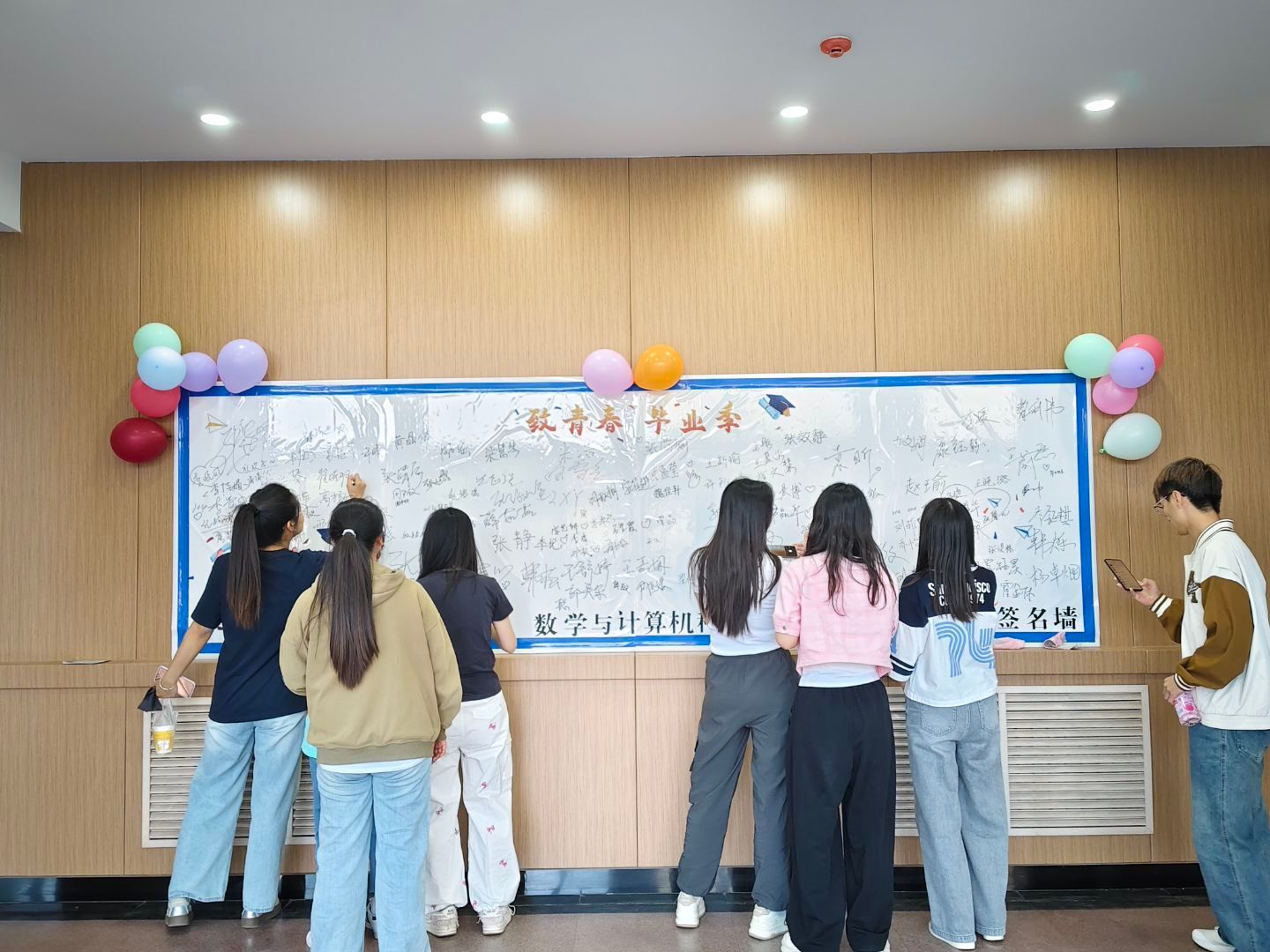 除了精彩的节目演出,毕业生们还将自己的青春印记留在签名墙上,笔锋间藏着对校园的眷恋。不仅如此,晚会现场还精心策划了趣味十足的游戏与惊喜抽奖环节,让观众们能够沉浸式参与其中,感受毕业季的氛围……现场满是热烈而欢快的气氛,每一个角落都充满了欢声笑语。